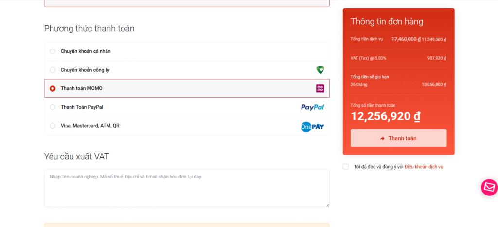 Lưu ý: dịch vụ sẽ được khởi tạo trong giờ hành chính sau khi thanh toán thành công.