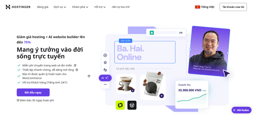 Với coupon Hostinger, bạn có thể tiết kiệm tới 90% chi phí, nhận ngay tên miền miễn phí, tặng thêm 3 tháng hosting và nhiều ưu đãi hấp dẫn cho Shared Hosting, VPS, WordPress, Cloud. Đây là cơ hội vàng để khởi tạo website, blog hay dự án kinh doanh online với chi phí siêu tiết kiệm mà vẫn tận hưởng hạ tầng hiện đại, tốc độ cao và hỗ trợ 24/7.