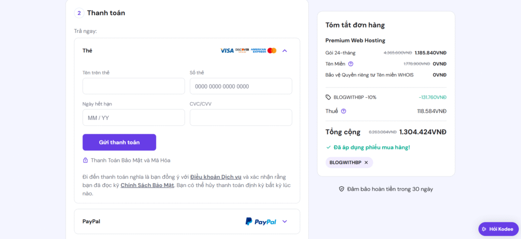 Bước 6: Thanh toán Tiến hành thanh toán bằng thẻ hoặc PayPal để hoàn tất đăng ký.