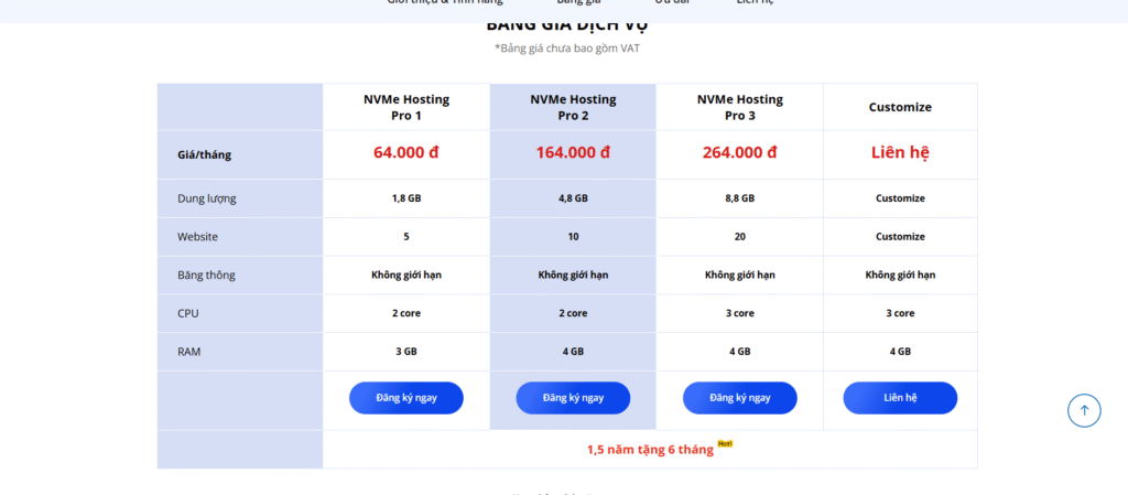 - COMBOHE3 (700K) – dành cho SMEs, muốn website mạnh mẽ hơn với NVMe Hosting Pro.
