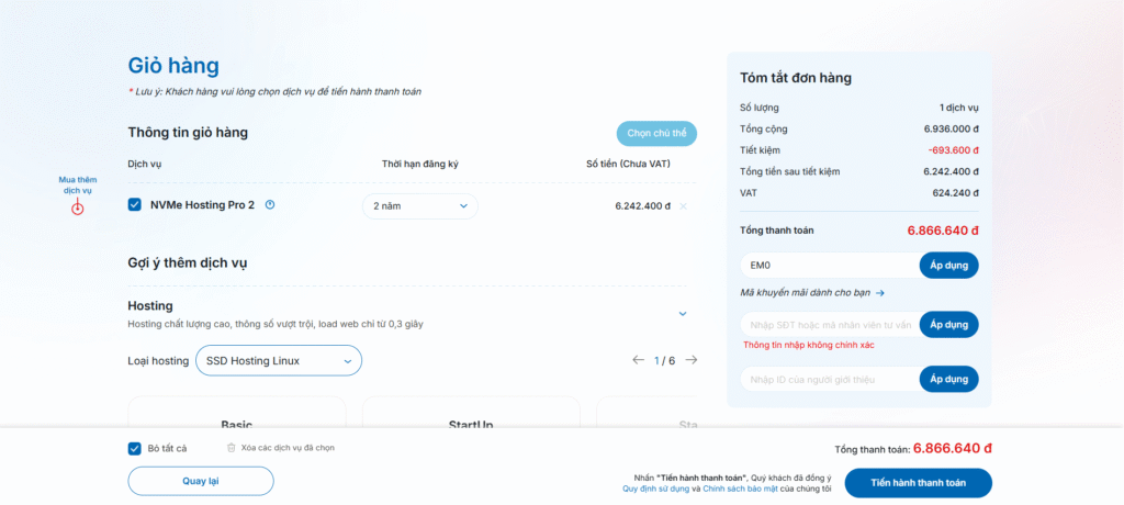 Bước 3: Nhập mã giảm giá vào ô “Coupon/Khuyến mãi” ở bước thanh toán (ví dụ: COM193, NET314, FREEDM1Y, HE12M…).