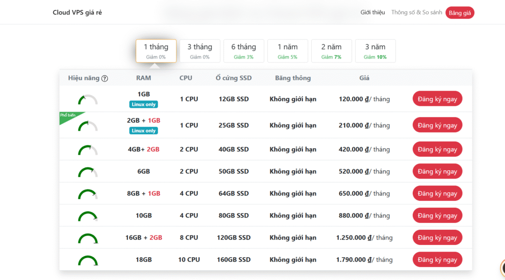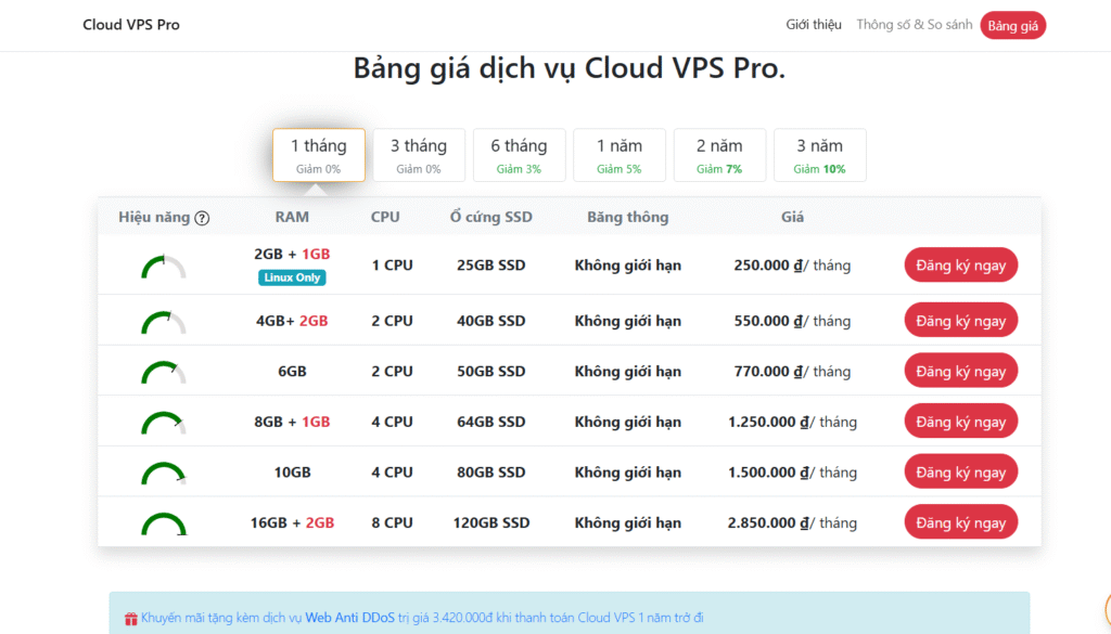 | Hiệu năng vượt trội, bảo mật cao | Dung lượng gói rẻ nhất thấp |