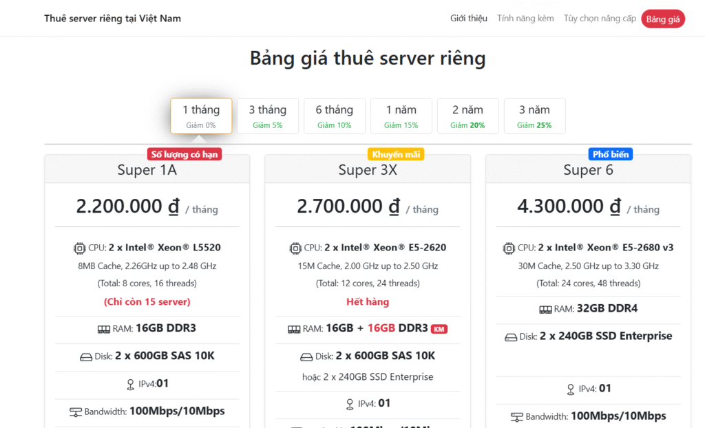 - Đặc điểm: Dịch vụ cho thuê server vật lý hiệu năng cao, phần cứng Enterprise (Dell, Supermicro, HP), hỗ trợ quản trị miễn phí.