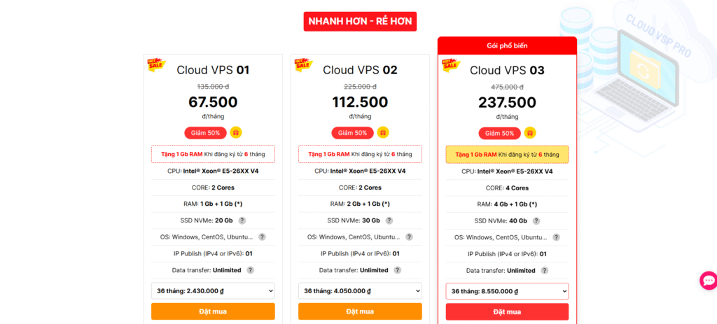 - RAM: 1GB – 20GB (tặng thêm khi đăng ký ≥ 6 tháng).