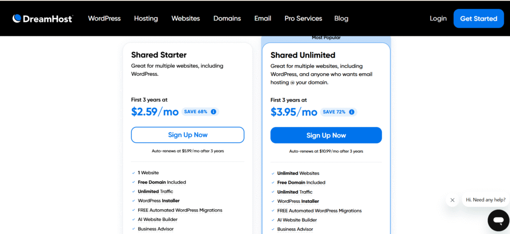 Tổng quan: Gói Shared Hosting của DreamHost phù hợp cho cá nhân, blogger hoặc website nhỏ. Hỗ trợ SSD, SSL miễn phí, bảng điều khiển tùy chỉnh dễ dùng và backup tự động.