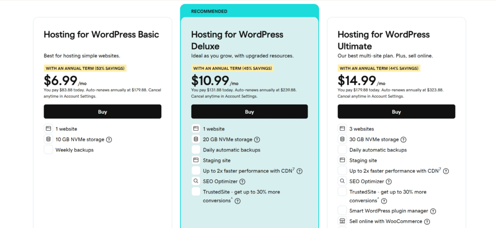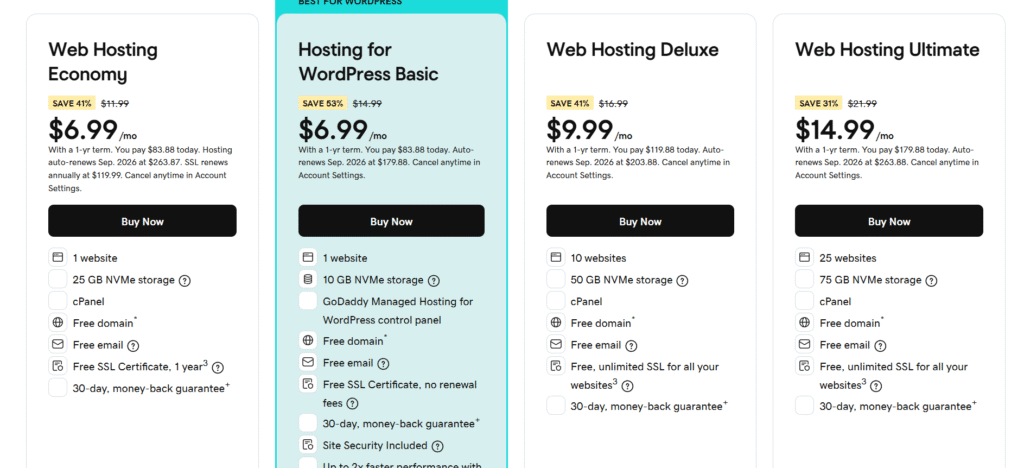 GoDaddy cung cấp nhiều gói hosting đáp ứng nhu cầu từ cá nhân đến doanh nghiệp, với các lựa chọn sau: