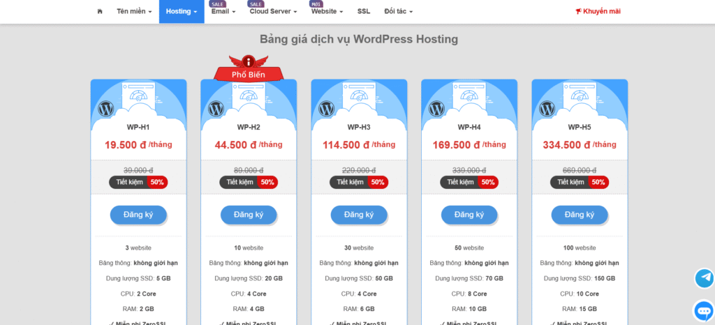Tối ưu chuyên sâu cho WordPress, tốc độ nhanh, bảo mật cao | Gói WP-H1 dung lượng thấp, chỉ phù hợp blog nhỏ |