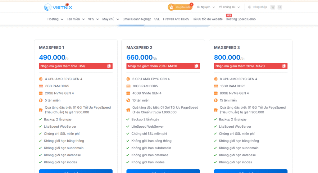4. MaxSpeed Hosting – Gói cao cấp nhất của Vietnix