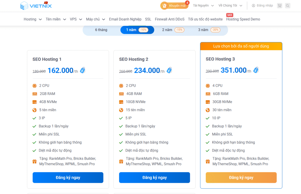 - Lợi ích: hỗ trợ IP riêng cho từng website, tốc độ cao, tối ưu Core Web Vitals, plugin SEO bản quyền.