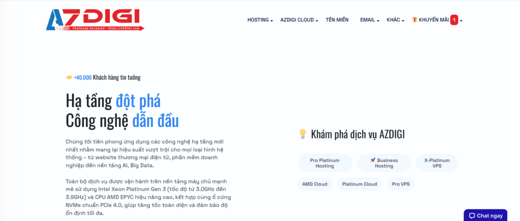 Phạm vi dịch vụ của AZDIGI bao gồm nhiều giải pháp đa dạng, từ các gói Hosting giá rẻ cho cá nhân, freelancer và blog nhỏ, đến VPS/Cloud Server mạnh mẽ phục vụ các doanh nghiệp vừa và các dự án TMĐT lớn, có khả năng chịu tải cao và hỗ trợ các công nghệ mới nhất như LiteSpeed Enterprise, SSD NVMe Gen4.
