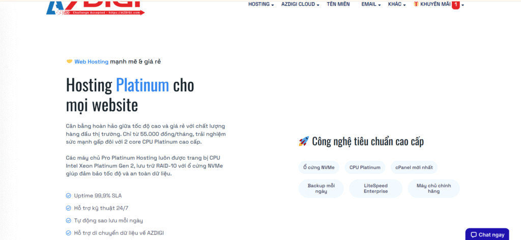 AZDIGI sử dụng CPU Intel Xeon Platinum và AMD EPYC thế hệ mới, kết hợp với ổ SSD NVMe Gen4 tốc độ cao, mang lại hiệu năng xử lý vượt trội. Đặc biệt, tất cả các gói Hosting đều được tối ưu bằng LiteSpeed Enterprise, giúp giảm thời gian tải trang, tối ưu Core Web Vitals, và đặc biệt phù hợp với WordPress và các website TMĐT.
