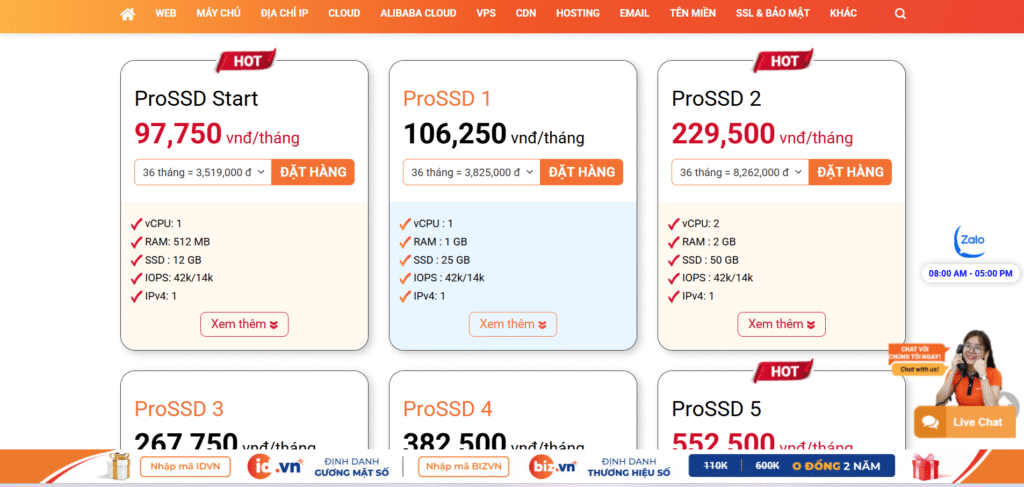- VPS: VPS giá rẻ, VPS NVMe, VPS cao cấp (RAM lớn, CPU mạnh) cho hệ thống yêu cầu hiệu năng cao.
