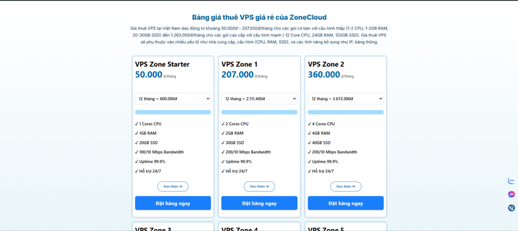 - ZoneCloud: Dành cho doanh nghiệp lớn, SaaS, game, AI/Big Data cần hạ tầng mạnh, băng thông cao, bảo mật toàn diện và SLA cao.