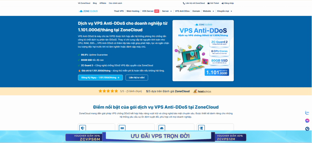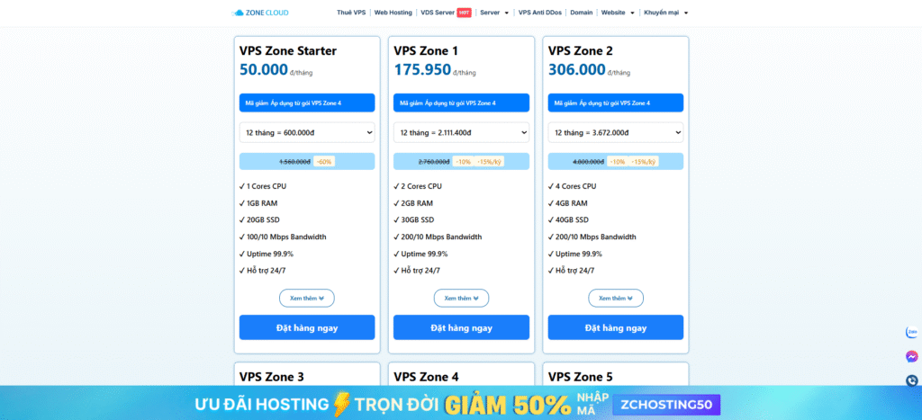 | VPS / Cloud VPS | Từ 207.000đ/tháng, có nhiều gói linh hoạt theo RAM/CPU. Hỗ trợ thanh toán theo tháng, quý, năm. | Giá cao hơn khoảng 10–15% so với ZoneCloud nhưng bao gồm HA cluster, SLA uptime nâng cao, hỗ trợ mở rộng nhanh. |